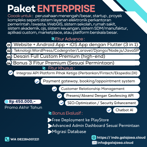 Cocok untuk : perusahaan menengah/besar, startup , proyek kompleks seperti sistem layanan elektronik perkantoran pemerintah /swasta, WebGIS, sistem sekolah, rumah sakit, sistem akademik, ojs, sistem keuangan, sistem SDM/manufaktur, aplikasi custom, marketplace, atau platform berskala besar.