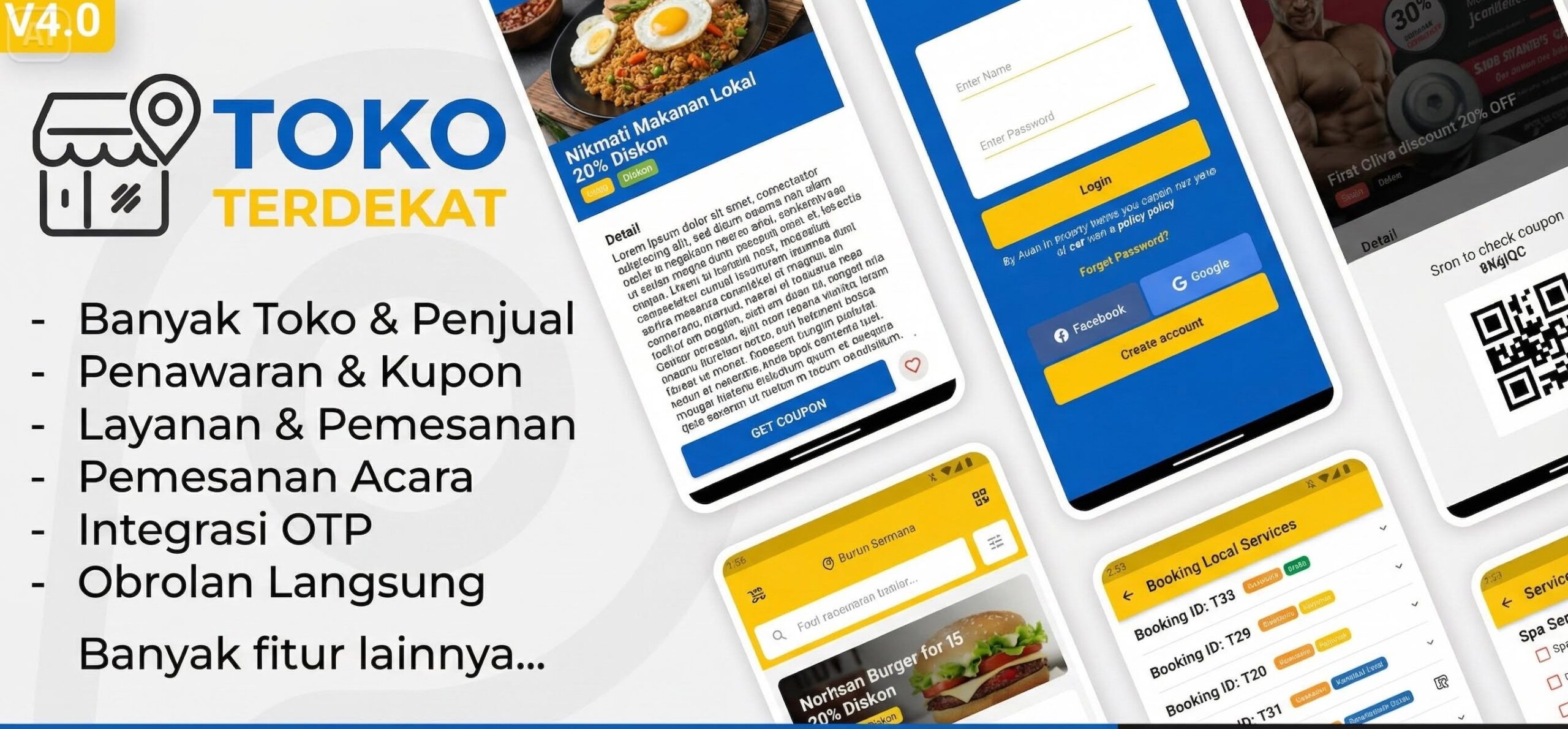 TokoTerdekat adalah aplikasi Android berbasis lokasi yang dirancang untuk membantu pengguna menemukan berbagai tempat dan layanan terdekat, seperti restoran, hotel, klinik, bengkel, toko, dan beragam kategori bisnis lokal lainnya. Aplikasi ini terintegrasi dengan sistem backend dan dashboard admin berbasis web, sehingga pemilik bisnis dapat mengelola informasi usaha, promo, kupon, event, booking, pembayaran, serta berkomunikasi dengan pelanggan melalui chat realtime dan notifikasi. TokoTerdekat dikembangkan menggunakan teknologi Android Native (Kotlin/Java) dengan backend PHP CodeIgniter dan REST API yang aman, mendukung berbagai metode pembayaran lokal dan internasional, serta memiliki arsitektur yang scalable dan cloud ready. Aplikasi ini cocok digunakan oleh pengguna umum maupun pelaku usaha dan UMKM untuk meningkatkan jangkauan pelanggan, promosi, dan penjualan. Produk ini dilengkapi dengan full source code aplikasi Android dan admin panel, database, dokumentasi lengkap, serta dapat dikustomisasi dan dipasarkan ulang sebagai startup lokal, marketplace wilayah, directory bisnis, atau sistem SaaS berbasis lokasi.
